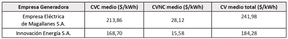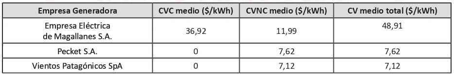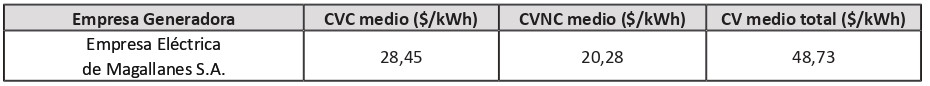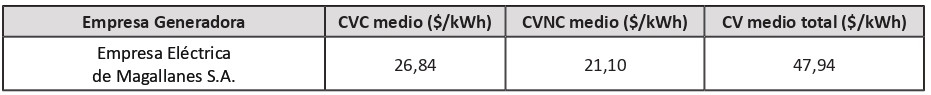Para efectos de la repartición de la recaudación por venta de energía y potencia a clientes regulados, el costo variable medio total de cada empresa generadora de los Sistemas Medianos de Punta Arenas, Puerto Natales, Porvenir y Puerto Williams, correspondiente al promedio ponderado por generación esperada de los costos variables unitarios de generación, combustibles y no combustibles, considerados en la determinación de tarifas de aquellas unidades de generación asignables a cada empresa, son los que se detallan a continuación: