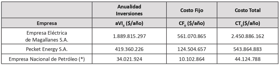 Por último, los costos de transmisión determinados a partir de la anualidad de la inversión y de los costos de operación, mantenimiento y administración de las empresas propietarias de instalaciones de transmisión que operan el Sistema Mediano de Punta Arenas, considerados en la determinación de la tarifa, son los que se presentan a continuación:
