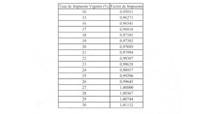 Los valores resultantes de la aplicación de los cargos anteriormente mencionados en este decreto se incrementarán en función de la tasa de tributación vigente que grava las utilidades de las sociedades anónimas abiertas, considerando los factores para las tasas de tributación que se indican a continuación (tasas intermedias se interpolarán linealmente):