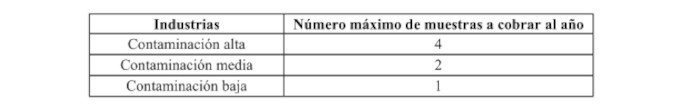 Los valores y número máximo de muestras a cobrar al año se han determinado de acuerdo a la clasificación de las industrias, según el nivel de contaminación del efluente evacuado, cuya definición se indica a continuación: