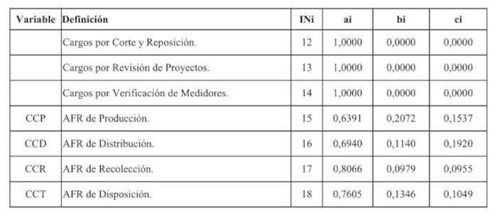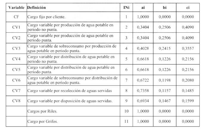 La definición de las variables incorporadas en las fórmulas tarifarias anteriores y sus respectivos valores, al 31 de diciembre de 2022, son los indicados a continuación: