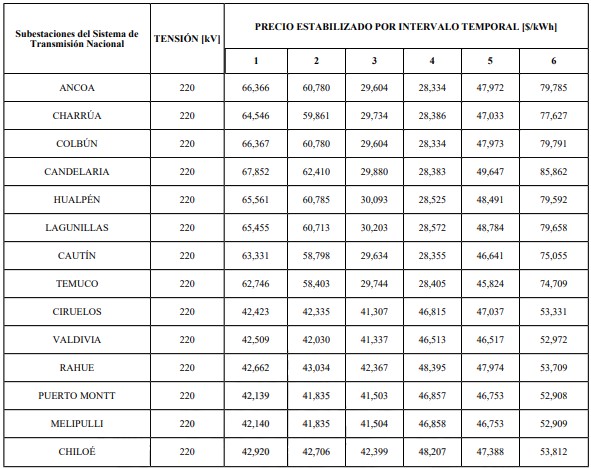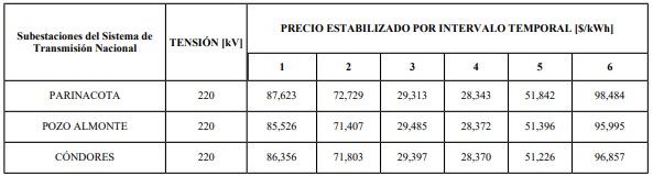 A continuación, se detallan los precios estabilizados por intervalo temporal aplicables a los medios de generación de pequeña escala, en las subestaciones denominadas "Subestaciones del Sistema de Transmisión Nacional" y para los niveles de tensión que se indican: