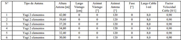 - Arreglo de antenas de acuerdo a la siguiente tabla: