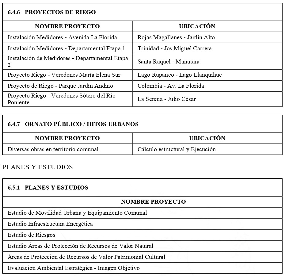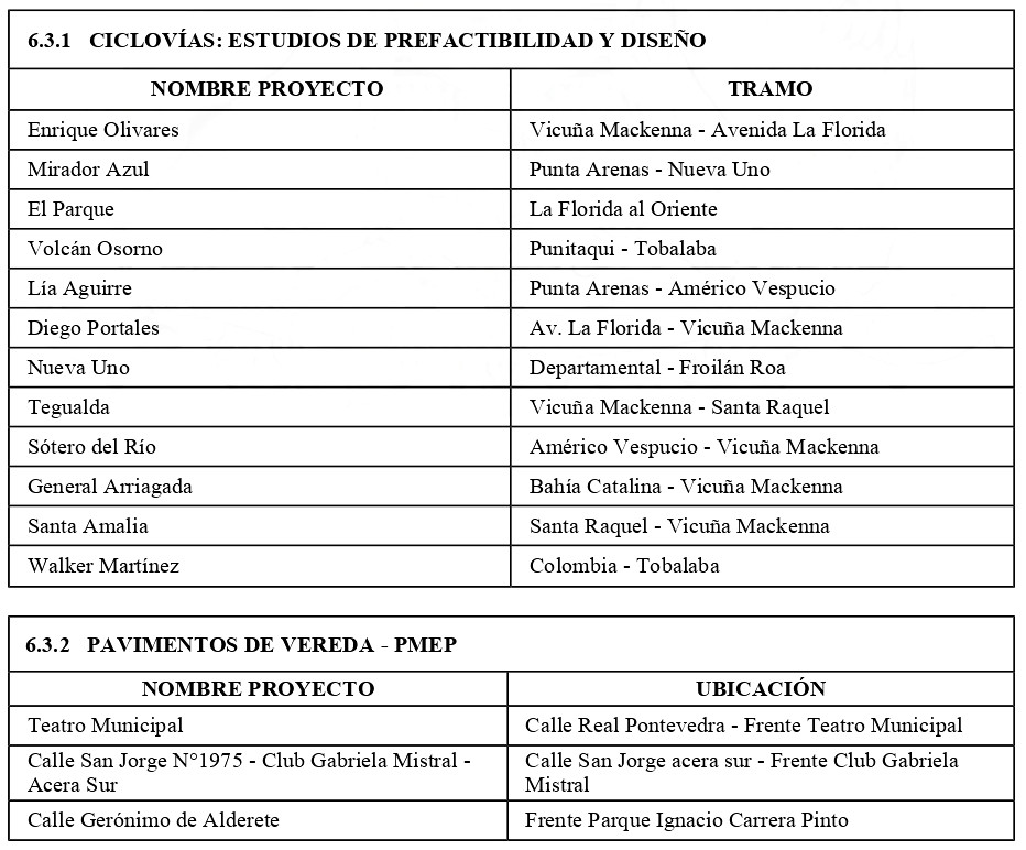 La cartera proyectos de infraestructura de movilidad y espacio público que conforman el Plan de Inversión en Infraestructura de Movilidad y Espacio Público (PIIMEP) de la comuna de La Florida, se actualiza según el siguiente detalle: