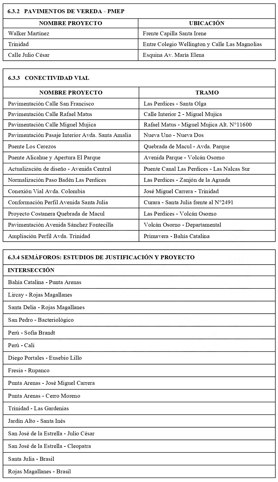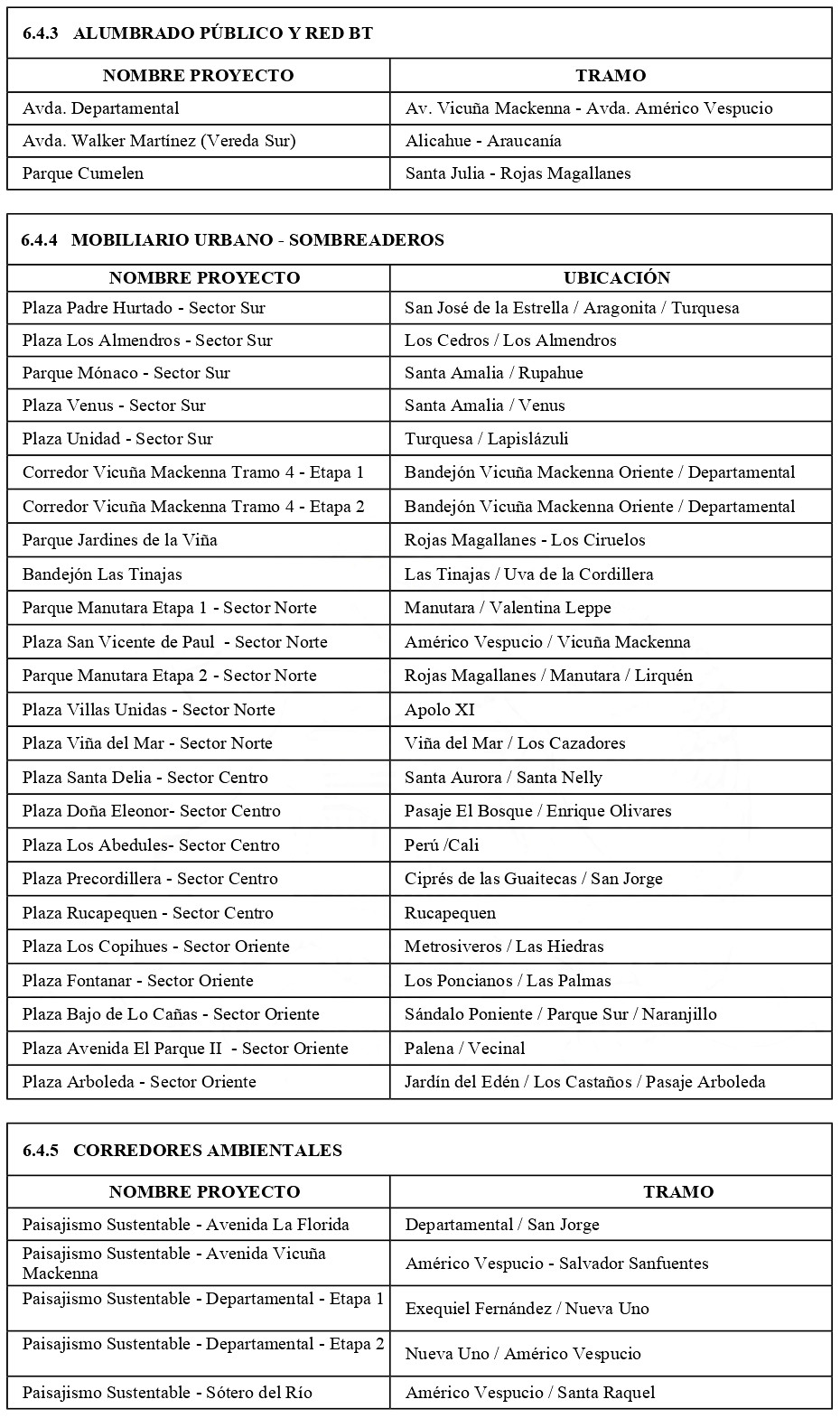 1. Cartera priorizada de proyectos, obras y medidas, incluidas en los instrumentos de planificación territorial existentes o asociadas a éstos, debidamente priorizadas, para mejorar sus condiciones de conectividad, accesibilidad, operación y movilidad, así como la calidad de sus espacios públicos y la cohesión social y sustentabilidad urbana, referidas a áreas verdes, aceras y circulaciones peatonales, pasos para peatones, calzadas, ciclovías, luminarias y alumbrado público, soterramiento de redes, paraderos de buses, señalética, áreas de juegos infantiles, baños públicos, mobiliario urbano tales como bancos o escaños, basureros o contenedores de basura, estacionamientos de bicicletas, kioscos, pérgolas, entre otros.