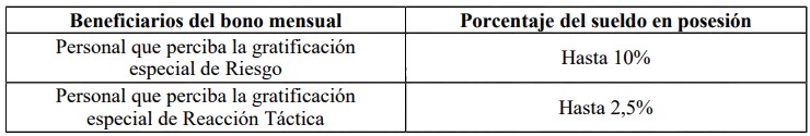 El monto mensual del bono ascenderá al valor que resulte de aplicar los siguientes porcentajes al sueldo en posesión, según corresponda: