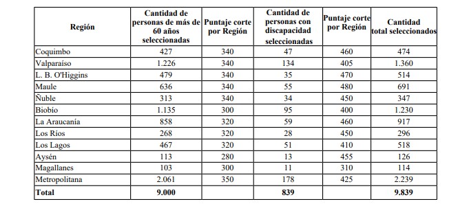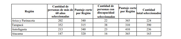 2. Apruébanse las nóminas de postulantes seleccionados correspondientes al llamado dispuesto en el resuelvo 1. de la resolución exenta Nº 150 (V. y U.), de 2025, del Programa de Subsidio de Arriendo de Vivienda regulado por el DS Nº 52 (V. y U.), de 2013, en particular según lo establecido en su artículo 27, nóminas que se entenderán formar parte integrante de esta resolución, y fíjase en 9.839 el número de postulantes seleccionados de todo el país. La cantidad de seleccionados y los puntajes de corte regional se distribuyen regionalmente de acuerdo con la siguiente tabla: