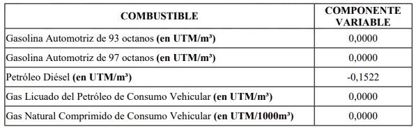1.- Determínanse los siguientes componentes variables de los impuestos específicos establecidos en la ley N° 18.502, que establece impuestos a los combustibles que señala, en virtud de lo señalado en el artículo 3 de la ley N° 20.765: