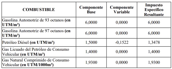 3.- Determínanse, como consecuencia de lo anterior, las tasas de los Impuestos Específicos de los Combustibles establecidos en la ley N° 18.502, los cuales serán iguales a su componente base, considerando además el componente variable, que puede ser sumado o restado según lo previsto en el artículo 3 de la ley N° 20.765 y lo dispuesto en el artículo 8 de su Reglamento.