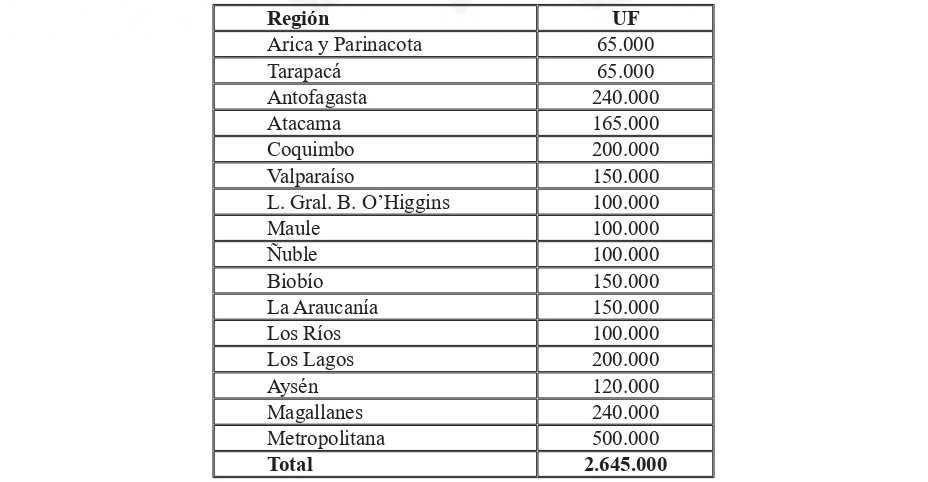 El monto de Unidades de Fomento (UF) que se destinará al financiamiento del subsidio directo a los/as trabajadores(as) seleccionado/as y de la asistencia técnica, y su distribución regional, se detalla en la siguiente tabla: