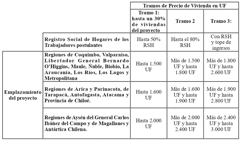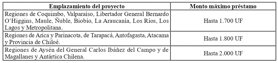 Este préstamo no podrá exceder de los montos que se señalan a continuación para cada vivienda, de acuerdo el con tramo de precio de vivienda y región de emplazamiento del proyecto: