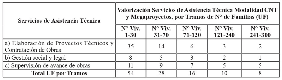Los honorarios a pagar por los servicios de asistencia técnica se calcularán en función del número de familias integrantes del grupo, considerando los montos fijados para cada tramo. Para las primeras 30 familias se considerará un máximo de 54 UF por cada una. Si el grupo considera hasta 70 integrantes, se aplicará el subsidio de 54 UF a 30 familias y las restantes del grupo obtendrán un subsidio de hasta 28 UF por cada una, que se sumará al monto determinado para las primeras 30 familias. En la medida que se vaya aumentando el número de familias conforme a los rangos establecidos en la tabla precedente, se aplicará el mismo mecanismo.