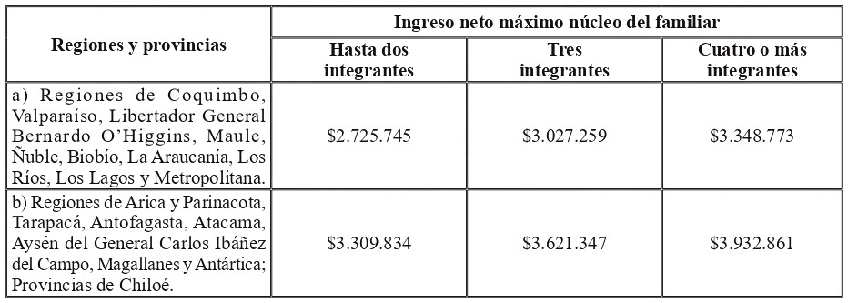 En el caso de trabajadores(as) que estén sobre el 90% más vulnerable de la población de conformidad con el Instrumento de Caracterización Socioeconómica vigente, el núcleo familiar declarado en la postulación no podrá tener ingresos netos (ingreso bruto menos impuestos e imposiciones) que excedan de los que a continuación se detallan: