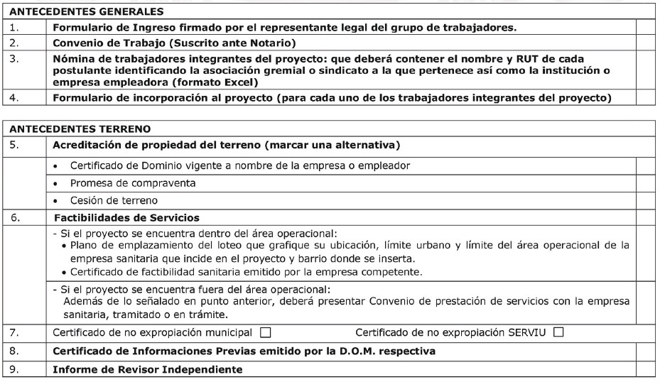 El o los grupos de trabajadores/as postulantes, con el patrocinio del o los empleadores, deberán presentar un proyecto habitacional, en un terreno, que cumpla con los requisitos del presente llamado. El proyecto será revisado en mesas técnicas previas a la postulación y deberá contar con la aprobación del Servicio de Vivienda y Urbanización como requisito anterior a la formalización de la postulación.