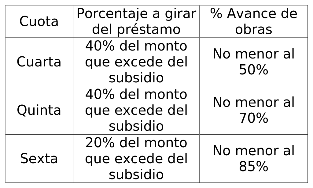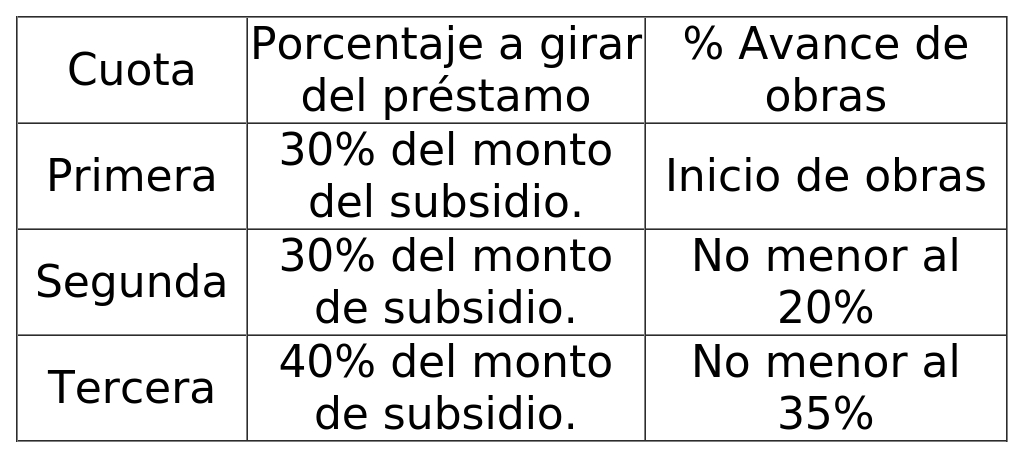 D.O. 07.11.2025l préstamo se pagará en seis cuotas contra avance de obras. El total de las tres primeras cuotas giradas no podrá exceder del monto de subsidio correspondiente a cada vivienda para estos tramos según la región de emplazamiento del proyecto. El resto del préstamo, correspondiente a la parte que excede del monto del subsidio, se pagará en tres cuotas. En caso de empresas privadas y públicas o de instituciones públicas, para el giro de la primera cuota el terreno deberá estar traspasado al Serviu. Una vez giradas las seis cuotas del préstamo y que el Serviu haya verificado la ejecución del 100% de las obras, éste podrá autorizar el giro del ahorro mantenido hasta ese momento en forma anticipada, a solicitud del beneficiario.