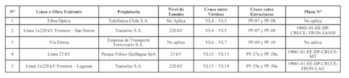 En su recorrido, las instalaciones del Proyecto afectarán las líneas eléctricas, obras e instalaciones existentes que se indican a continuación: