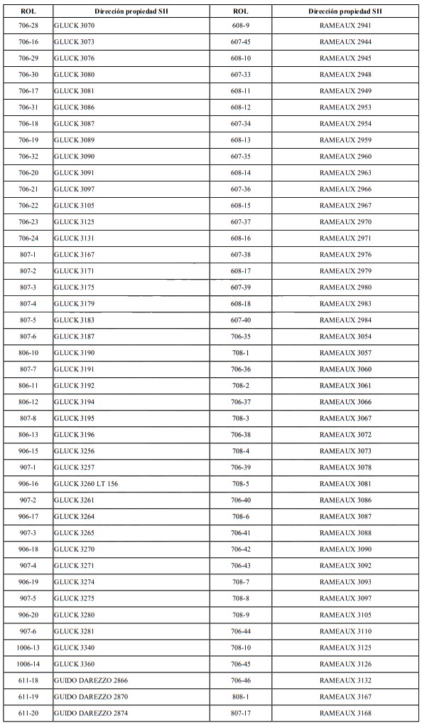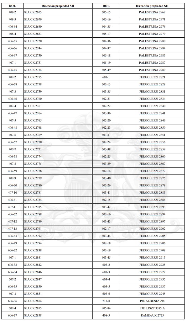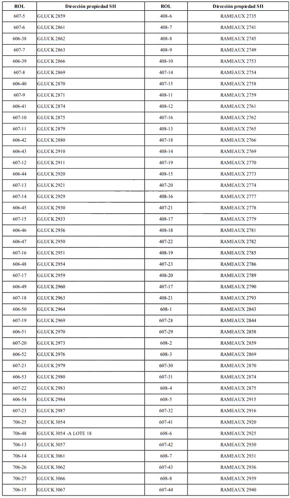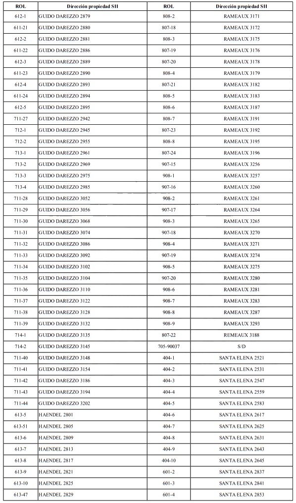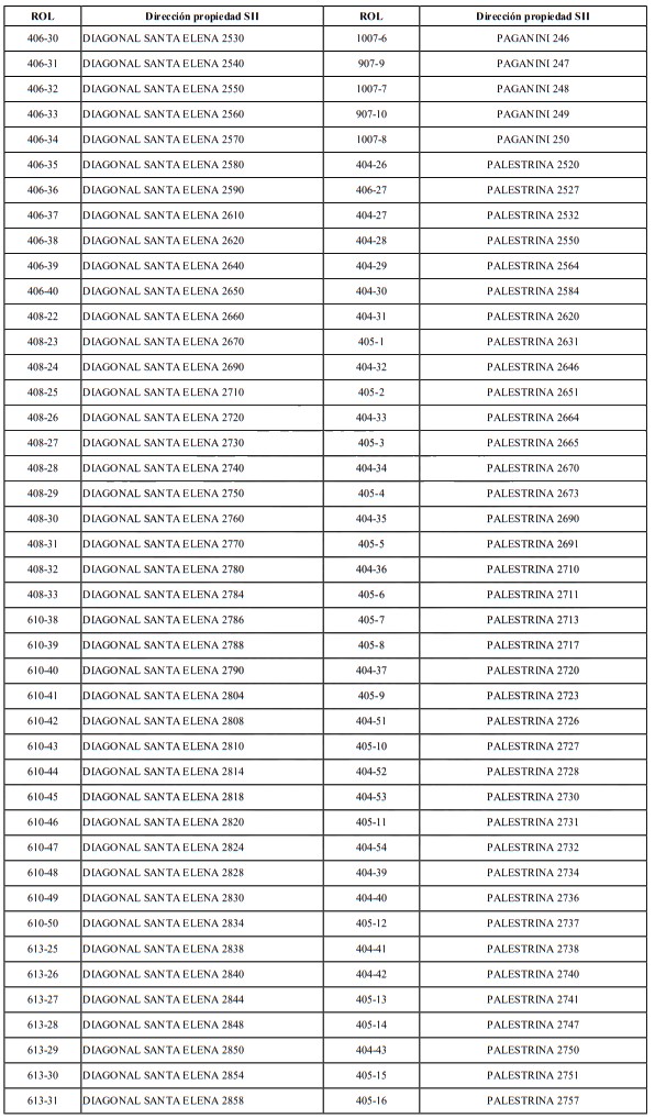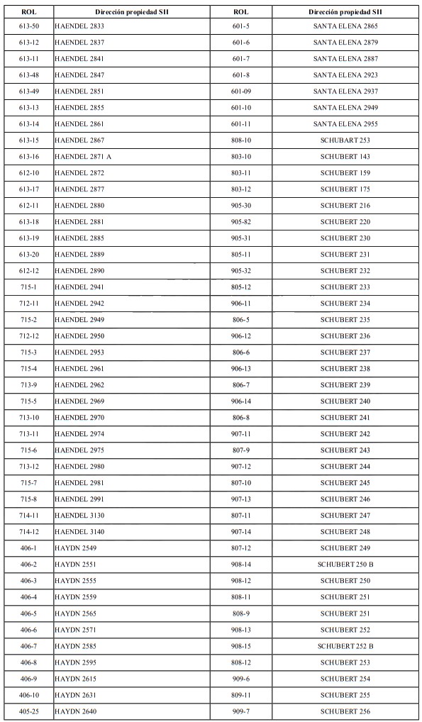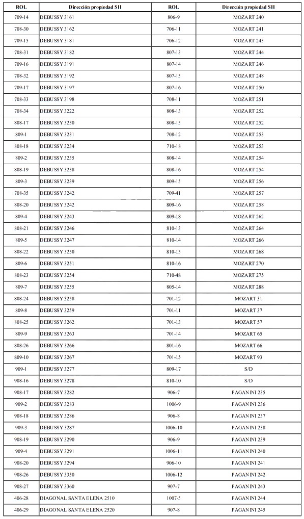 4. Que, a partir del trabajo técnico desplegado por la Secretaría Técnica del CMN, se ha determinado que los inmuebles a ser parte de esta ZT se ubican dentro de los predios con los números de rol y dirección SII que a continuación se indican: