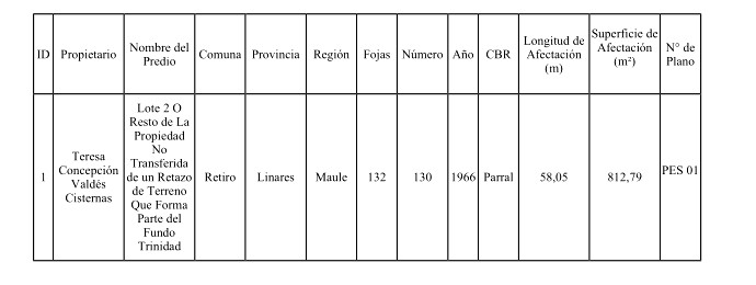 Artículo 7º.- Constitúyanse, de acuerdo con lo establecido en la Ley General de Servicios Eléctricos, la servidumbre para el establecimiento del Proyecto en el predio que se indica a continuación: