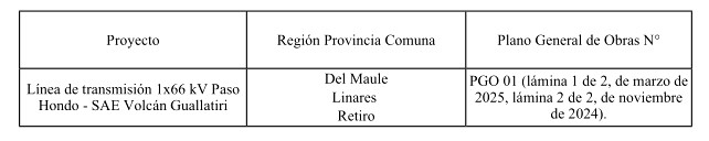 El Proyecto considera una longitud total de 86,29 metros, medidos desde la estructura ML.1 ubicada al interior de la Subestación Paso Hondo (existente), coordenadas Este: 236.060,56 metros y Norte: 6.009.614,81 metros, hasta la estructura ML.2, ubicada al interior de la Subestación SAE Volcán Guallatiri (proyectada), coordenadas Este: 236.114,05 metros y Norte: 6.009.652,31 metros.
