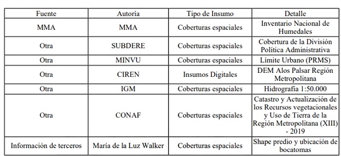 Para la elaboración del análisis de gabinete en el proceso de declaración del humedal urbano Río Maipo de Melipilla, se recopilaron diversas fuentes de información que permitieron caracterizar ambiental y territorialmente el área de estudio. En particular, se incorporaron coberturas georreferenciadas obtenidas desde distintas instituciones públicas, universidades, centros de investigación y actores privados. A continuación, se detalla toda la información técnica para el análisis de gabinete: