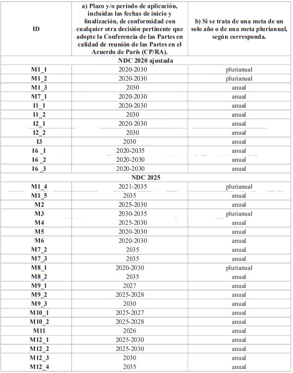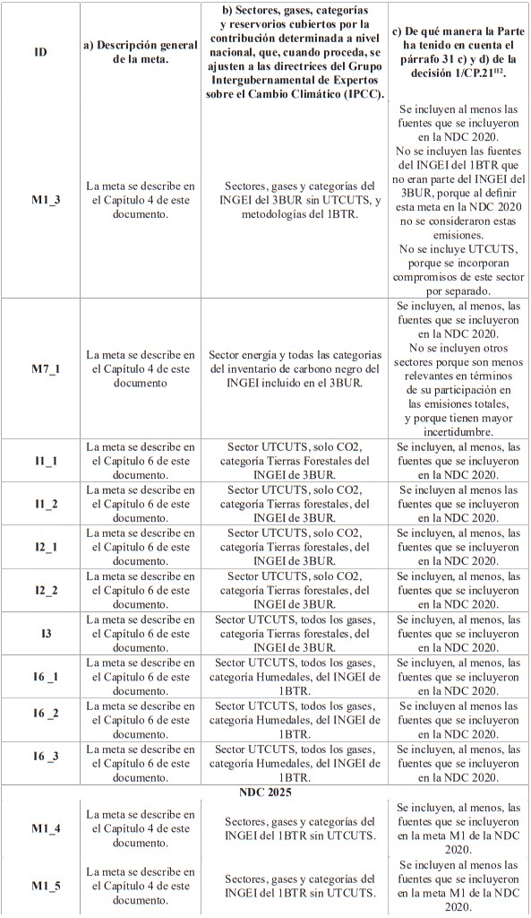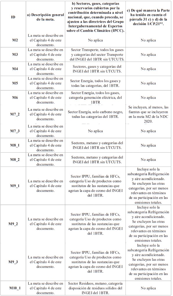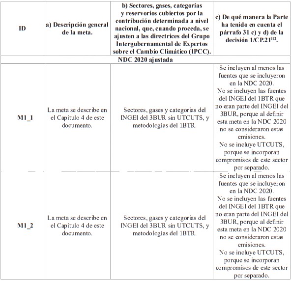 Esta NDC considera compromisos para contribuir al logro colectivo de los tres objetivos enunciados en el artículo 2 del Acuerdo de París, tanto componentes de adaptación como de mitigación, integración entre adaptación y mitigación, y medios de implementación incluyendo financiamiento. Las componentes de mitigación (M1 a M8 y I1 a I6) de la NDC consideran metas de reducción y absorción de emisiones que son compatibles con el objetivo de limitar el aumento de la temperatura media global por debajo de los 1,5°C en comparación con los niveles preindustriales.