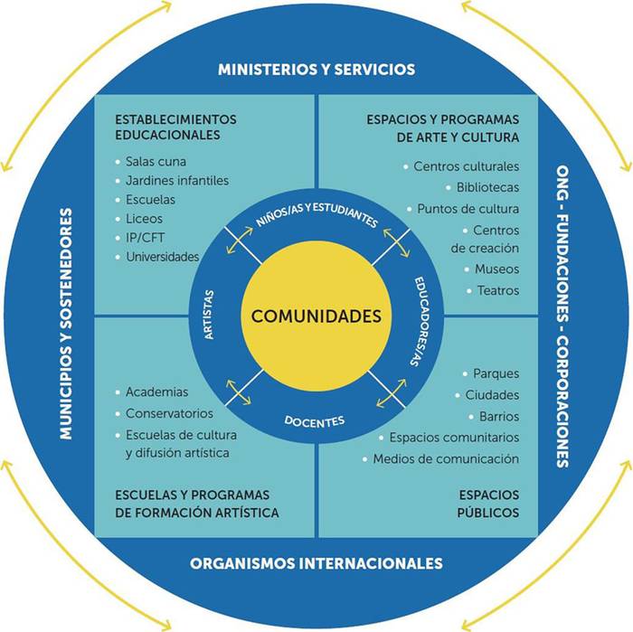 En el centro de esta política se encuentran las personas y sus comunidades, quienes desempeñan un papel activo en los procesos de educación artística como portadores de saberes y conocimientos y agentes culturales en sus territorios. Estas comunidades interactúan con el espacio público a través de su vida diaria en el barrio, la ciudad, los entornos naturales y los medios de comunicación, actuando como agentes de la educación informal e influyendo en la valoración social de los procesos culturales y artísticos. A su vez, las comunidades se relacionan con los Establecimientos Educacionales, a través de las salas cunas, los jardines infantiles, las escuelas, liceos e instituciones de educación superior. Estos espacios de educación formal cuentan con instrumentos específicos para el desarrollo de la educación artística (currículum, planes y programas, carreras y mallas de estudios, investigación, entre otros). Dentro de este sistema, es importante distinguir el subsistema de escuelas y liceos artísticos, cuyos proyectos educativos posibilitan que NNA tengan acceso a una formación artística sistemática y profunda durante sus trayectorias educativas.