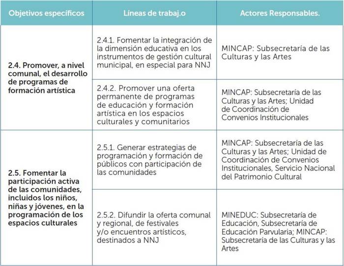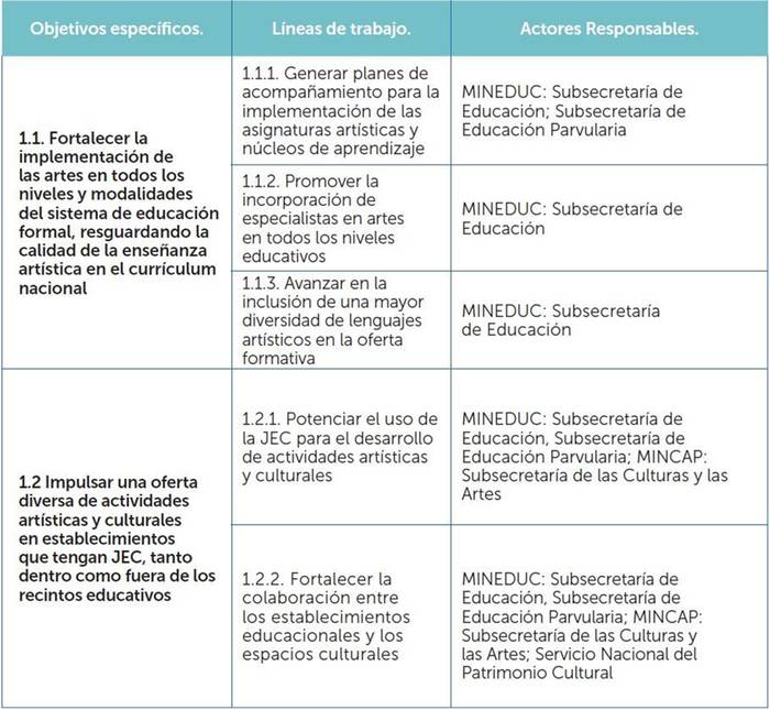Por todo lo anterior, el Ministerio de Educación (Mineduc) y el Ministerio de las Culturas, las Artes y el Patrimonio (Mincap) han acordado el desarrollo de cinco políticas públicas en materia de educación y cultura, que tienen como metas, fortalecer la democracia, la formación integral y la diversidad cultural, además de favorecer el desarrollo de aquellas habilidades y competencias que se requieren para enfrentar los desafíos de la contemporaneidad: