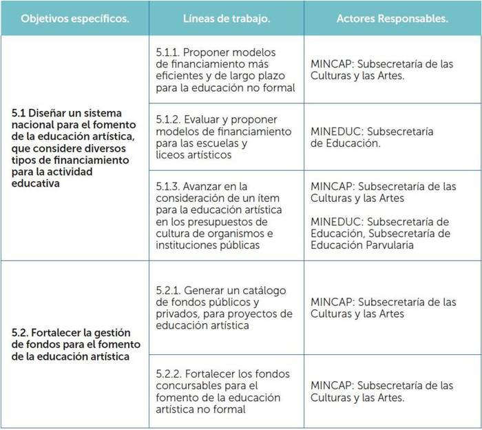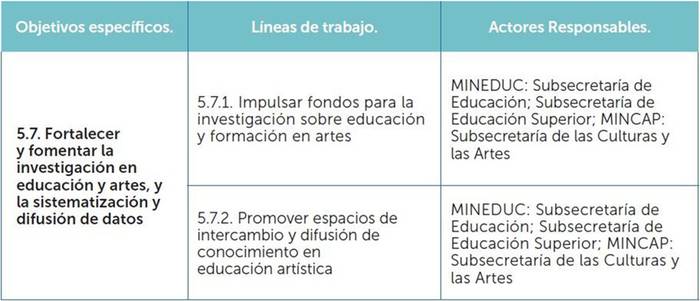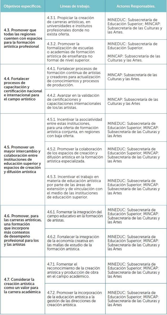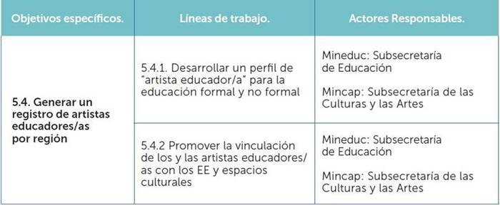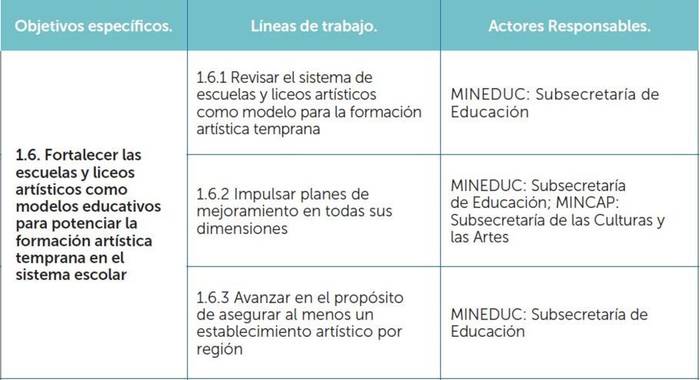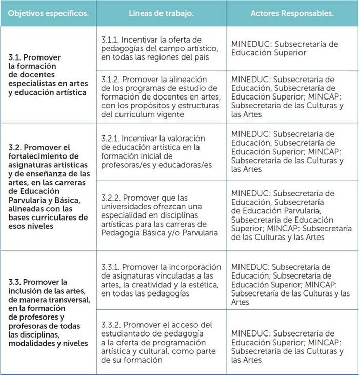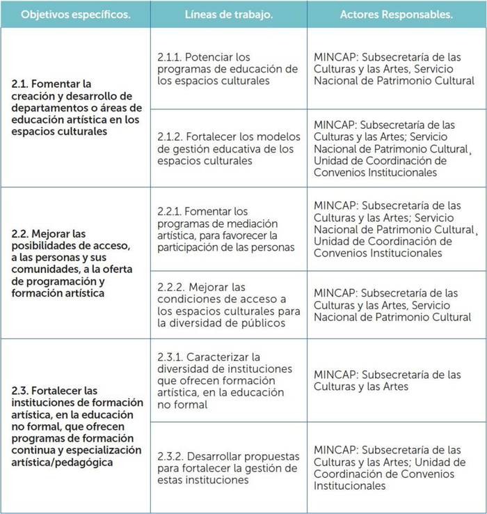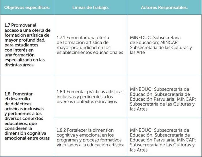 Fortalecer una educación artística de calidad para una formación y desarrollo integral de las personas, robusteciendo su presencia en el sistema de educación formal y fuera de éste, potenciando la formación de formadoras/es de distintos niveles y disciplinas, promoviendo la formación especializada, e integrando criterios de sostenibilidad que permitan su implementación desde un enfoque territorial, participativo, de género, intercultural, interdisciplinario e inclusivo.