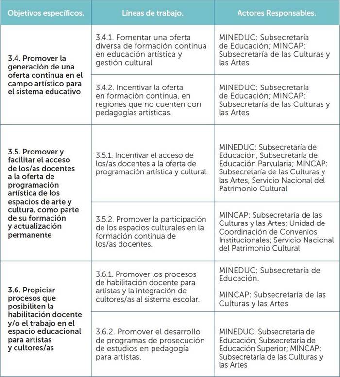 » Mesa Técnica de Educación Artística: instancia técnica encargada de gestionar los procesos vinculados a la implementación y seguimiento de la Política de Educación Artística, coordinada por el Departamento de Educación y Formación en Artes y Cultura de la Subsecretaría de Culturas y las Artes. Se encuentra conformada por representantes de las siguientes instituciones: