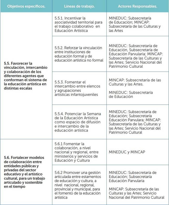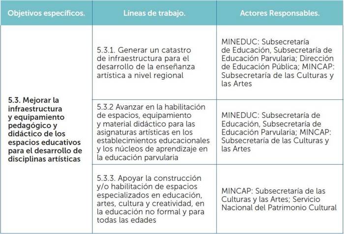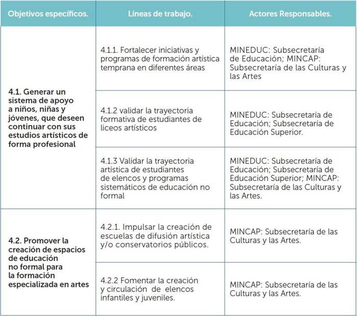 Para ello, se necesita una hoja de ruta que propenda al fortalecimiento de la educación artística en el sistema educativo, facilitando el desarrollo de las potencialidades y capacidades de niñas, niños y estudiantes. Además, es crucial robustecer los programas de educación artística en espacios no formales de arte y cultura, promoviendo una educación territorial, descentralizada y contextualizada para niñas, niños, adolescentes y adultos/as. Esta tarea requiere la participación activa de docentes de todos los niveles, educadores/as, artistas, y cultores/as.