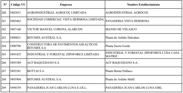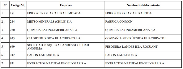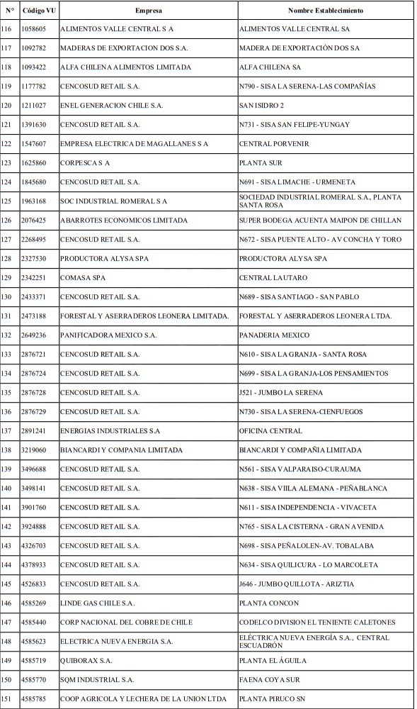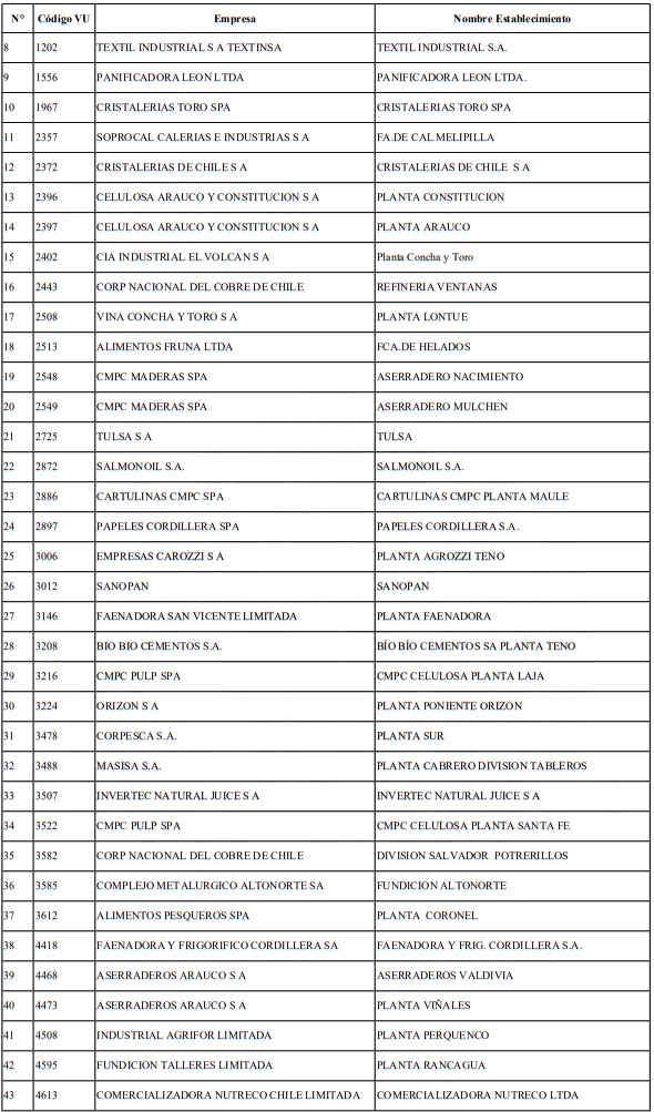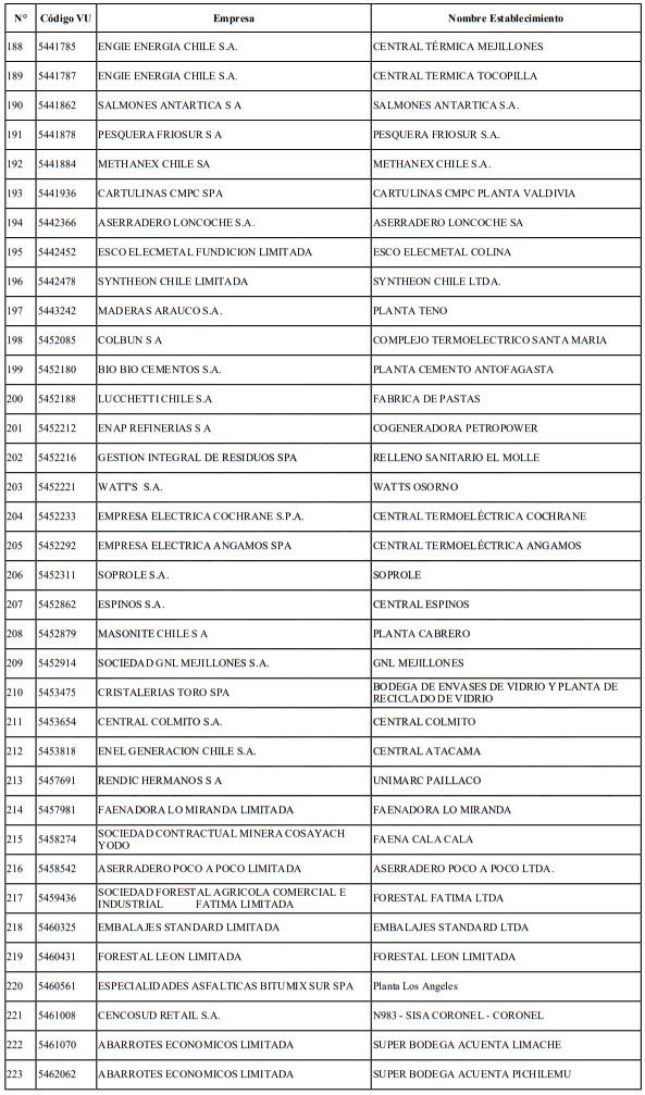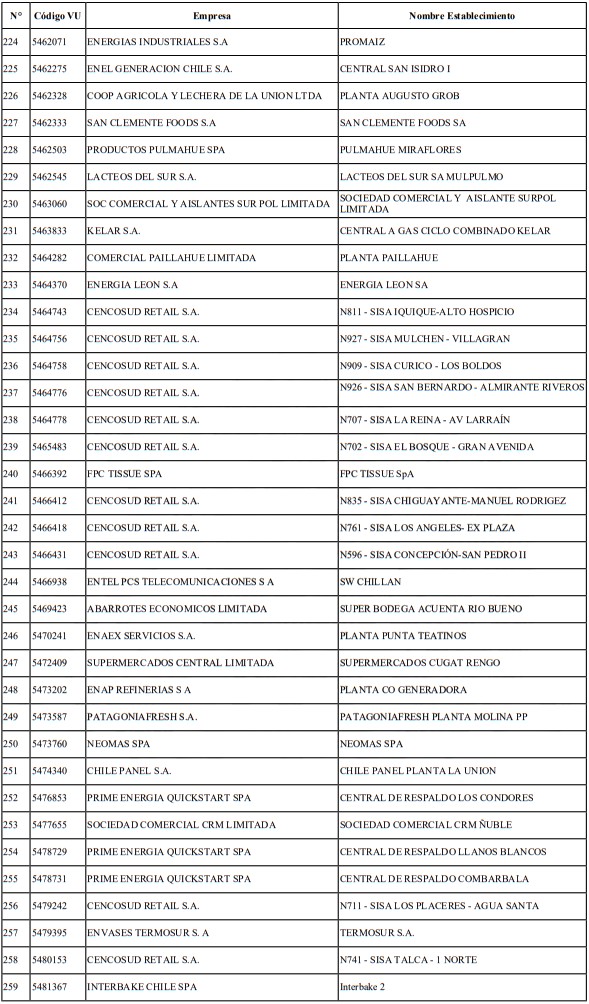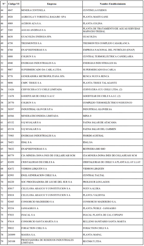 1.- Establézcase el siguiente listado de establecimientos sujetos a la obligación de reportar sus emisiones, de conformidad a lo dispuesto en los artículos 10 y 11 del decreto supremo Nº 63, de 2022, del Ministerio del Medio Ambiente: