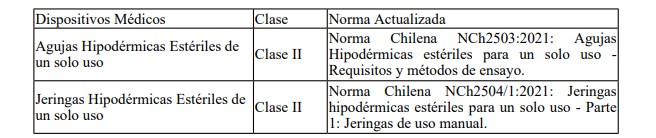 6º Que, mediante sus oficios Nº DD 221; Nº DD 538 y Nº DD 797, todos del año 2023, el Instituto de Salud Pública (ISP) informó la necesidad de actualizar las normas técnicas a las que debe sujetarse la verificación de conformidad de las agujas y jeringas, ambas hipodérmicas, estériles y de un solo uso, atendida la actualización de las normas chilenas realizada por el Instituto Nacional de Normalización (INN), con ocasión de la homologación de normas internacionales resultante en la aprobación de las Normas NCh2504/1:2021 y NCh2503:2021.
