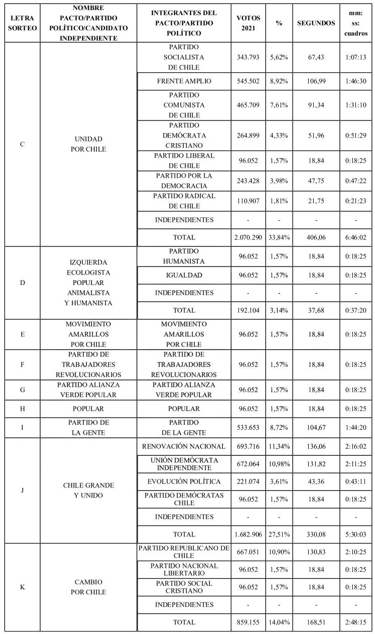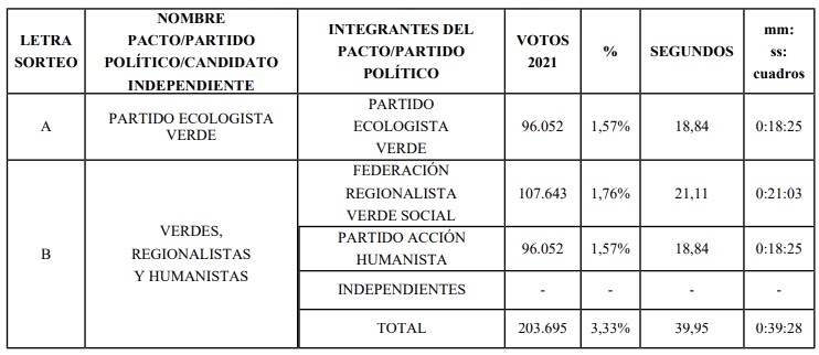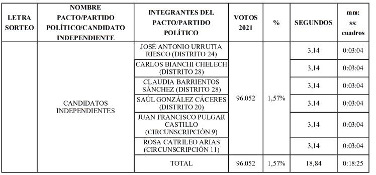 6. Que, de conformidad con lo dispuesto en el artículo 32 del DFL Nº 2 del año 2017 del Ministerio Secretaría General de la Presidencia, que fija el texto refundido, coordinado y sistematizado de la Ley Nº 18.700, Orgánica Constitucional sobre Votaciones Populares y Escrutinios, al conjunto de candidaturas independientes corresponde un tiempo equivalente al del partido político que haya obtenido menor cantidad de sufragios en la última elección parlamentaria, esto es, el Partido Liberal, cuyo tiempo es 18 segundos y 13 cuadros, el que debe distribuirse en partes iguales entre todas las candidaturas independientes.