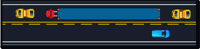 En cuanto al posicionamiento de los vehículos de acompañamiento, su ubicación se debe localizar en posiciones estratégicas, prioritariamente en la retaguardia, para advertir a otros conductores sobre la presencia del convoy, tal como se muestra en el siguiente diagrama.