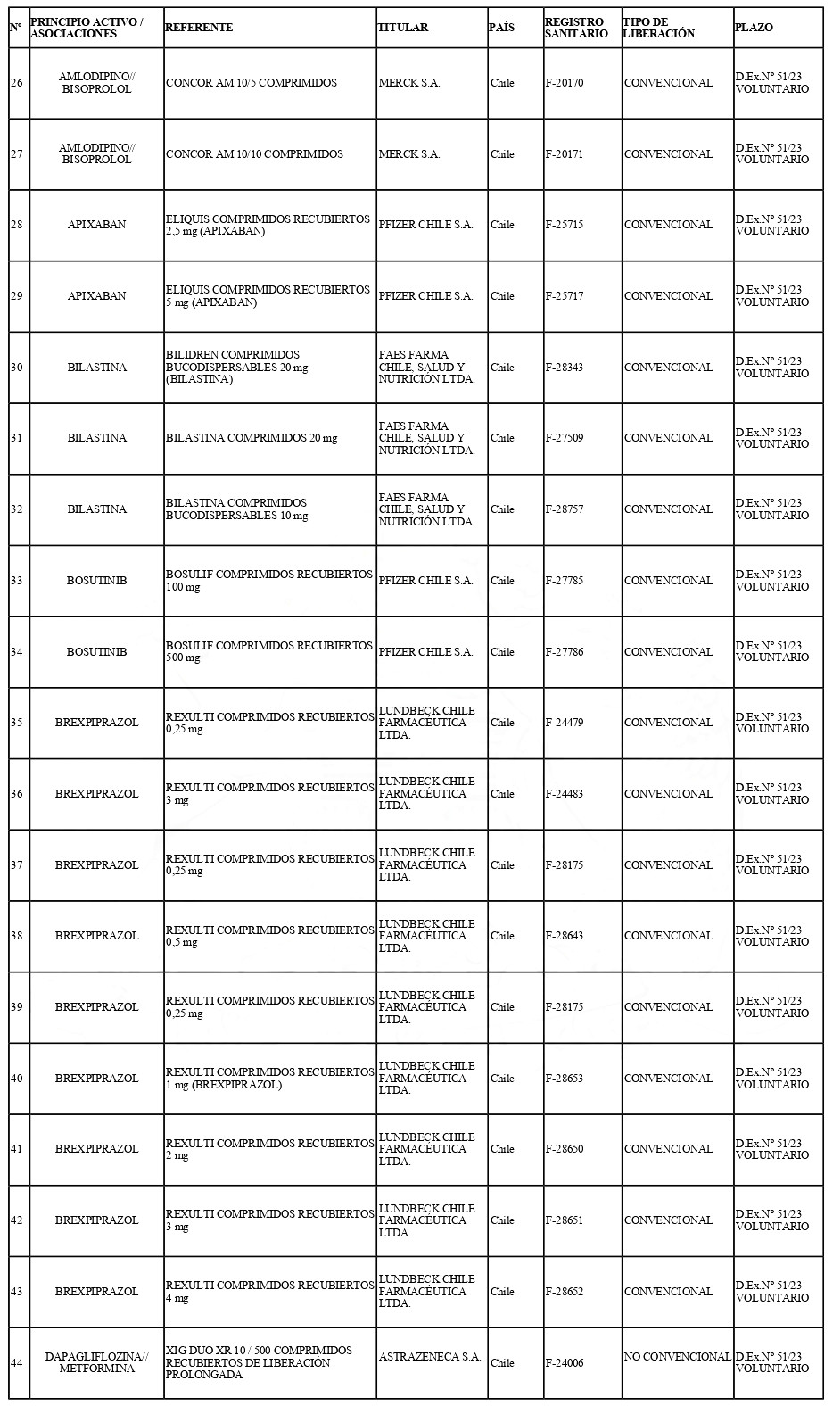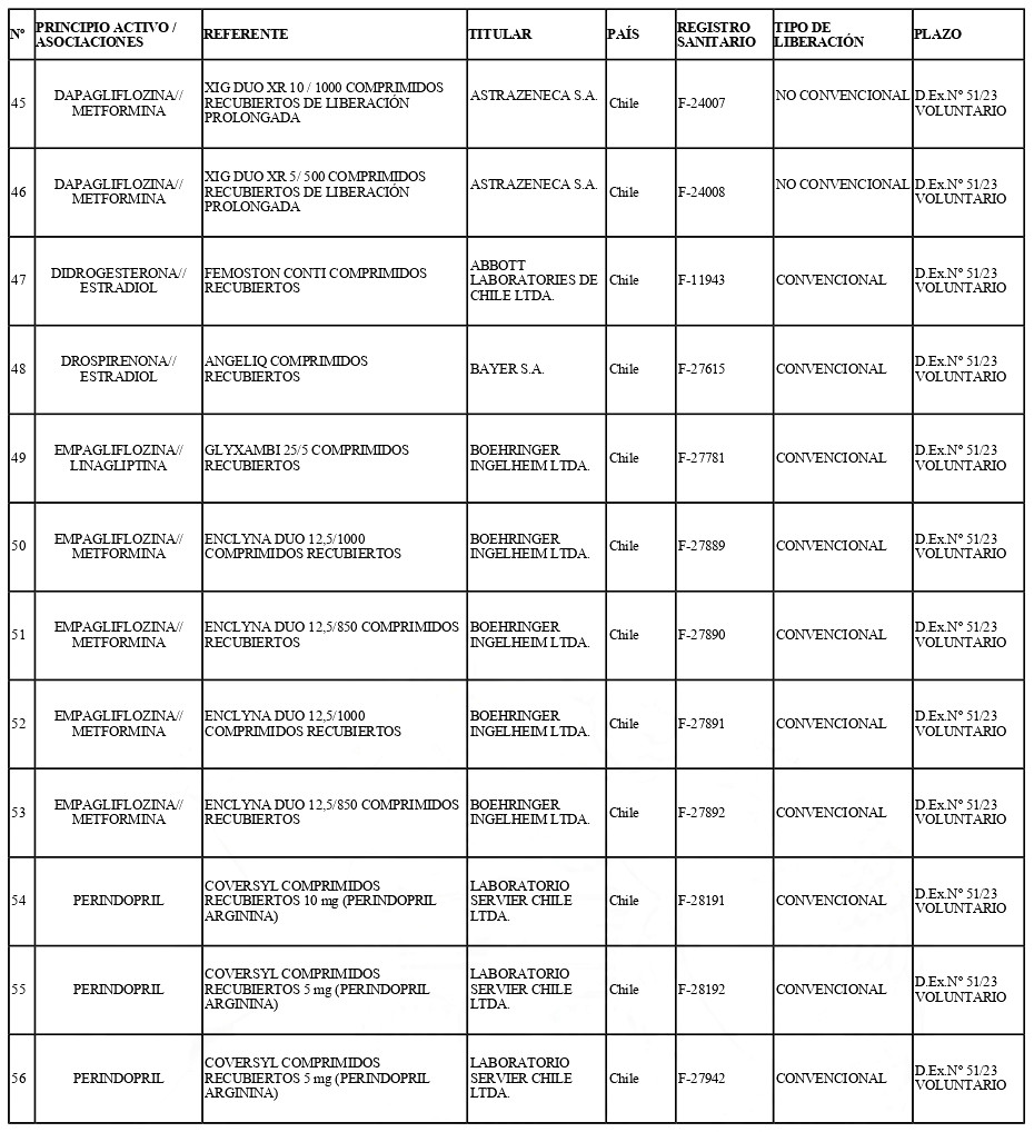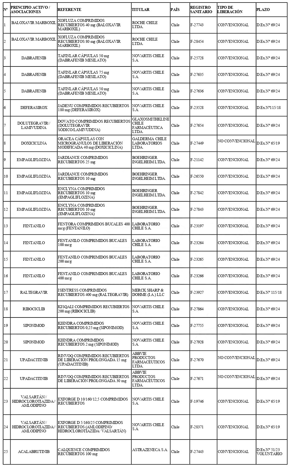 "Otórgase plazo hasta el 30 de septiembre de 2027, para que a todo titular de registro sanitario de un producto farmacéutico que reúna alguna de las características descritas en el Punto 4.2. de la Norma Técnica Nº 131, "Norma que define los criterios destinados a establecer la equivalencia terapéutica en productos farmacéuticos en Chile", aprobada mediante el decreto exento Nº 27, de fecha 18 de enero de 2012, del Ministerio de Salud, presente ante el Instituto de Salud Pública de Chile los antecedentes para demostrar su equivalencia terapéutica. El mismo plazo señalado precedentemente aplicará para productos farmacéuticos registrados por los principios activos o sus asociaciones que se indican en el listado incorporado más abajo, que deban cumplir con la señalada demostración y se presenten como formulaciones masticables, bucodispersables, dispersables, láminas bucodispersables o cualquier otra forma farmacéutica de administración oral, que difiera de aquella en la que se presenta el respectivo producto de referencia establecido para la realización de los estudios de equivalencia terapéutica.