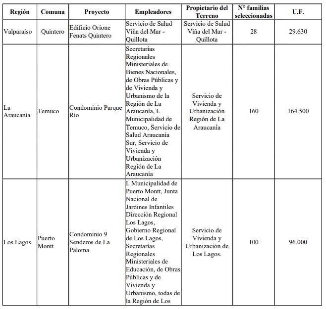 4. Apruébanse los proyectos que se singularizan a continuación y las respectivas nóminas de postulantes seleccionados, asociados a dichos proyectos, para el subsidio habitacional correspondiente al Llamado a postulación y presentación de Proyectos de Integración Social en condiciones especiales para el otorgamiento de subsidios habitacionales del Sistema Integrado de Subsidio Habitacional, regulado por el DS Nº 1 (V. y U.), de 2011, en la alternativa de postulación colectiva con proyecto habitacional, para un Programa de Vivienda para Organizaciones de Trabajadores, dispuesto por el resuelvo 1. de la resolución exenta Nº 466 (V. y U.), de 2024, nóminas que se adjuntan y que forman parte integrante de esta resolución, y fíjase el número de familias seleccionadas por proyecto y el monto de Unidades de Fomento (U.F.) que comprometen, de acuerdo con la siguiente tabla: