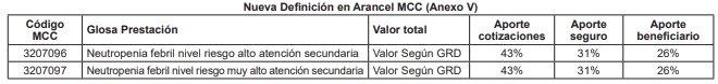 f.- Modifíquese en el Arancel MCC la ubicación de las prestaciones "Neutropenia febril nivel riesgo alto atención secundaria" y "Neutropenia febril nivel riesgo muy alto atención secundaria", que integraban el anexo IV "Arancel de Atenciones y Procedimientos Ambulatorios", las que pasan a integrar el anexo V "Arancel de Prestaciones de Acceso a Egresos Hospitalarios y Cirugía Mayor Ambulatoria", quedando de la siguiente manera: