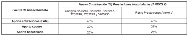 g.- Modifíquense los porcentajes de contribución actual de las fuentes de financiamiento de la Atención Hospitalaria, referentes a aporte de cotizaciones (FAM), aporte seguro y aporte beneficiario (copago), señalados en el anexo V del Arancel MCC, de acuerdo con la "Nueva Contribución" ilustrada según el siguiente detalle: