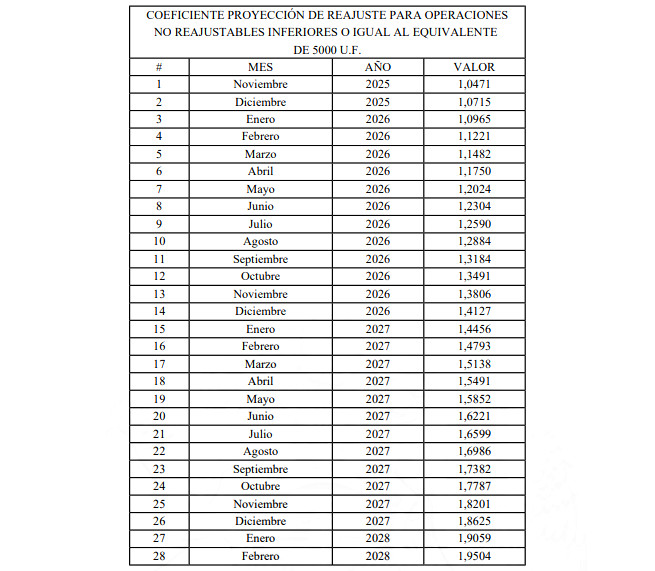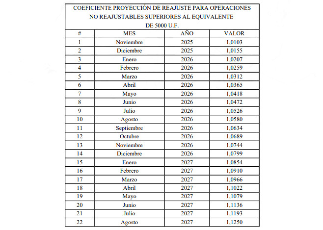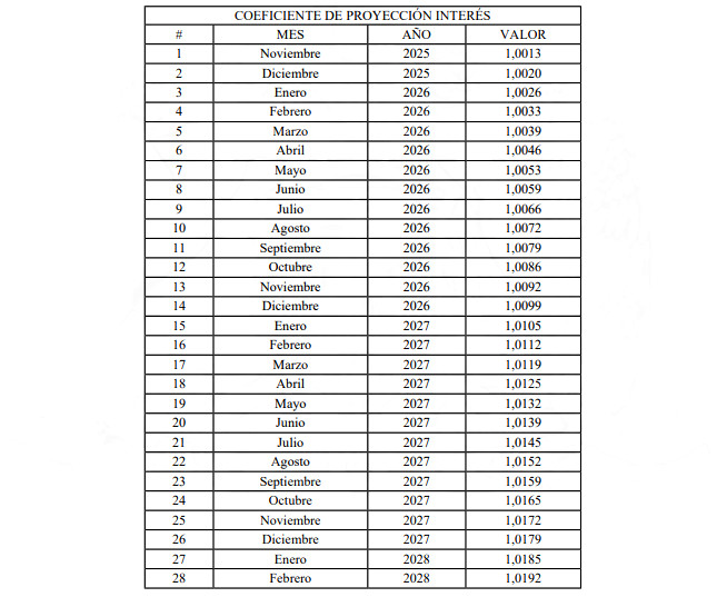 5º.- Estos coeficientes regirán para los efectos de calcular el monto adicional correspondiente a la proyección de reajuste y/o de interés de aquellas boletas bancarias de garantía cuya emisión se practique entre el 16 de octubre de 2025 hasta el 15 de noviembre de 2025, inclusive.