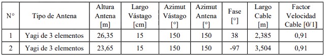 - Arreglo de antenas de acuerdo a la siguiente tabla: