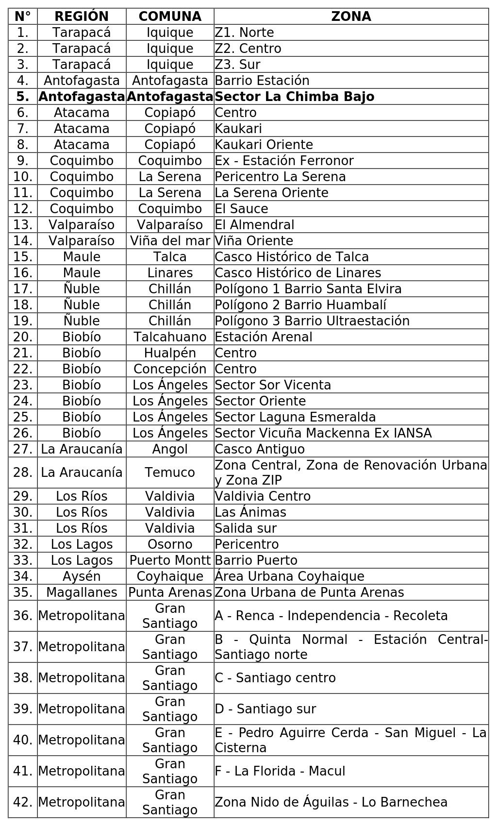 1. Modifícase la resolución exenta Nº 1.414 (V. y U.), de fecha 1 de septiembre de 2021, y sus modificaciones, en el sentido de reemplazar el Cuadro inserto en su resuelvo 1º, por el que se detalla a continuación, que incorpora la zona "Sector La Chimba Bajo", en la comuna de Antofagasta, Región de Antofagasta: