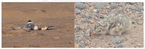 Figura 1: Individuo de Gaviotín Chico (adulto y dos polluelos) en nido (izquierda) y detalle de coloración del polluelo (derecha). Fuente: Seremi del Medio Ambiente, Región de Tarapacá (2019).