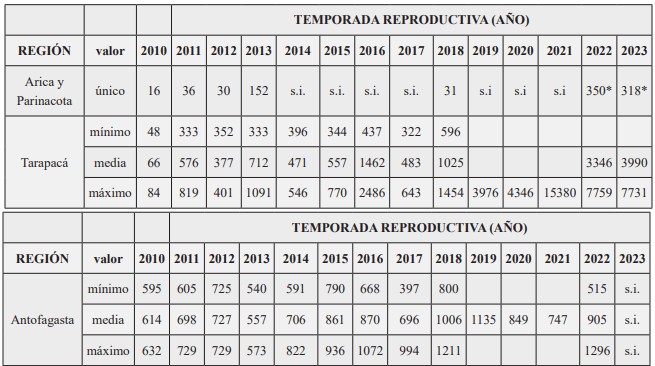 Guerra-Correa & Páez-Godoy (comunicación personal) ordenan datos de estimaciones realizadas en diversos sitios entre 2010 y 2019 para las regiones de Tarapacá y Antofagasta, entregando número de ejemplares mínimos, estimados según número de nidos (2n) y valor máximo, según ejemplares efectivamente avistados. Para Arica y Parinacota la información disponible es parcial entre los años analizados por ambos autores (Tabla 1 y Gráfico 1).