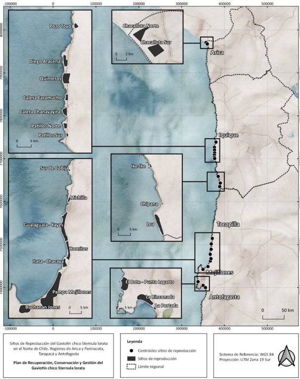 a) Norte y sur del Aeropuerto de Chacalluta: los gaviotines utilizan como sitio de nidificación una planicie de no más de 630 hectáreas ubicadas al sur del aeropuerto Chacalluta y otra de menor tamaño ubicada al norte. El polígono en su área norte actualmente no está restringido el acceso, por tanto, se han realizado algunas prospecciones encontrando mucha actividad de adultos y nidos con huevos. Durante el año 2021, fue posible visualizar más de 150 gaviotines adultos en el sitio, de alrededor de 136 ha (Fundación Gaviotín Chico, comunicación personal).