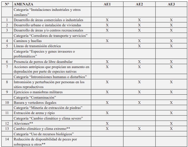 Considerando la información publicada, y el conocimiento del equipo de formulación del Plan, se identificaron 14 amenazas para los atributos ecológicos definidos, las que se manifiestan de manera diferenciada según cada uno de ellos. Las amenazas identificadas para cada atributo ecológico, categorizadas de acuerdo con Unión Internacional para la Conservación de la Naturaleza (UICN) - Conservation Measures Partnership (CMP), se muestran en la siguiente tabla: