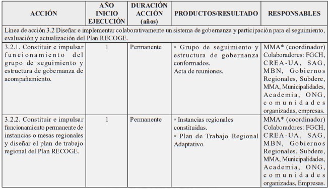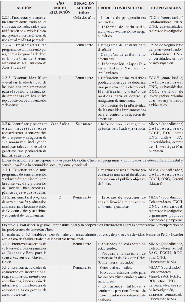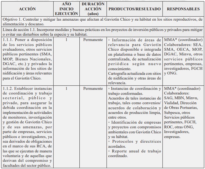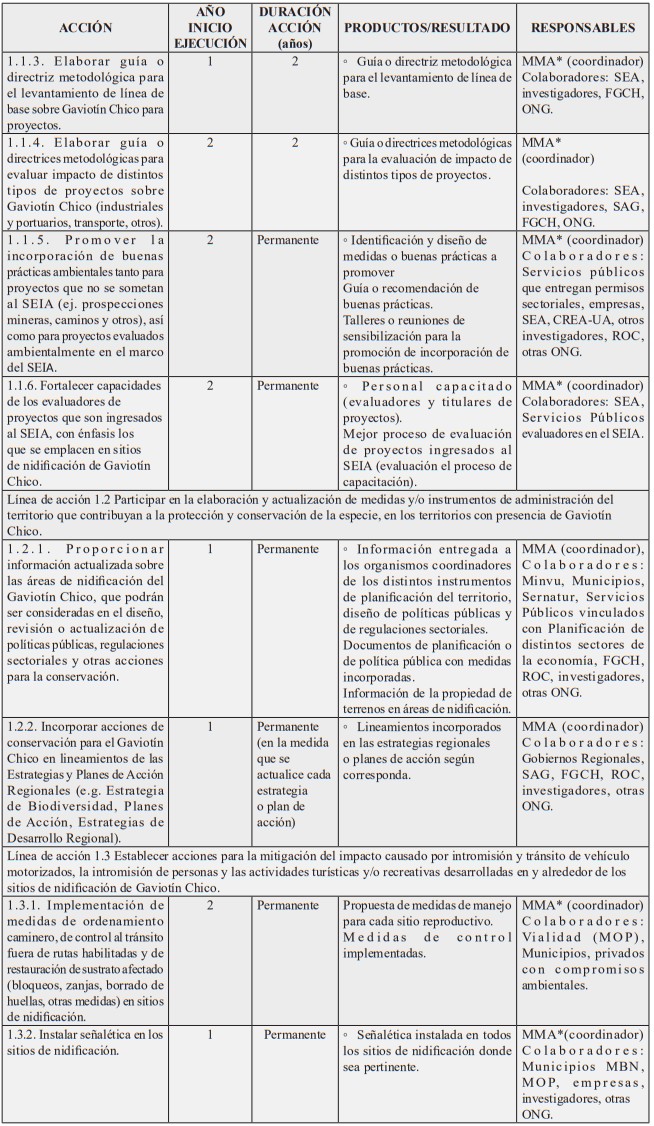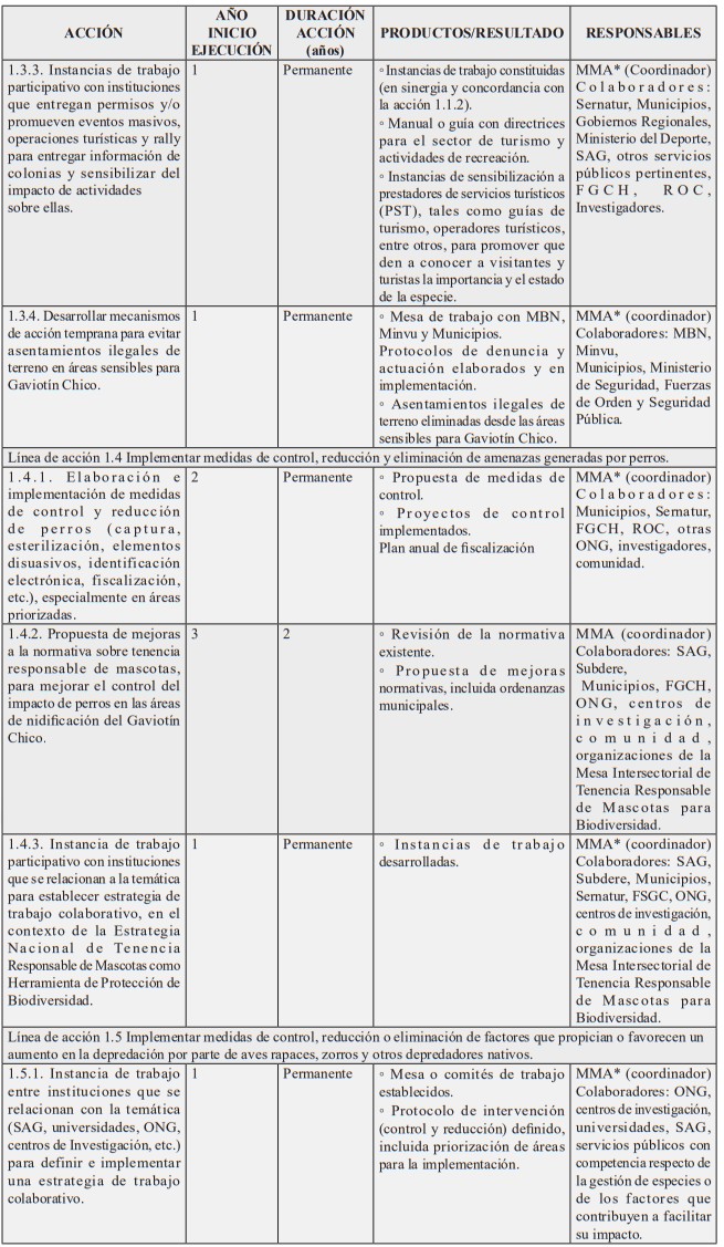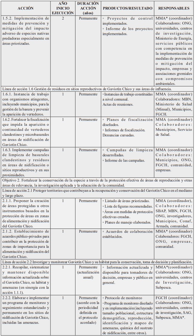 Nota: Dada la publicación de la ley N° 21.600 que crea el Servicio de Biodiversidad y Áreas Protegidas (SBAP) y el Sistema Nacional de Áreas Protegidas, con asterisco (*) se señalan las instituciones cuyo rol o responsabilidad en la acción señalada, será transferida o de responsabilidad del SBAP una vez que éste entre en operaciones, conforme a lo establecido en el artículo 5°, letra e), de la mencionada ley N° 21.600, y sin perjuicio de lo que disponga el reglamento a que hace referencia el inciso segundo del artículo 42 del referido cuerpo legal. Asimismo, se ha considerado el Ministerio del Medio Ambiente como institución colaboradora en aquellas acciones que serán posteriormente coordinadas por el SBAP y en las que posee competencias conforme al artículo 70 de la ley N° 19.300.
