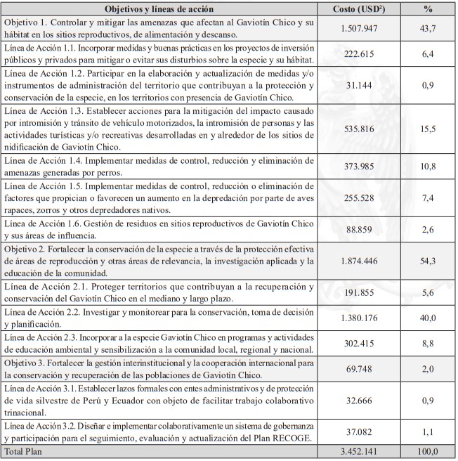 La implementación del Plan de Recuperación, Gestión y Conservación del Gaviotín Chico se estima en US$3.452.141 considerando un horizonte de 10 años. Este se desglosa en US$1.507.947 para el cumplimiento del objetivo N° 1, US$1.874.446 para el cumplimiento del objetivo N° 2, y US$69.748 en el caso del objetivo N° 3. La siguiente tabla presenta los costos del Plan por objetivos y por línea de acción.