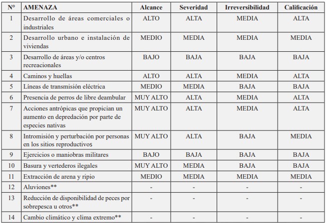 Las amenazas identificadas fueron calificadas en función de su alcance, severidad e irreversibilidad respecto al Gaviotín Chico como objeto de conservación del Plan, bajo los conceptos de estándares abiertos para la práctica de la conservación (CMP, 2013). El alcance corresponde a la proporción del objeto de conservación que se ve (o verá) afectado por la amenaza de aquí a 10 años, si continúa la tendencia actual; la severidad corresponde al nivel de daño causado al objeto de conservación por la amenaza, con la tendencia actual; y la irreversibilidad es la dificultad de revertir el daño causado por la amenaza al objeto de conservación, una vez controlada la amenaza. Esta metodología implica calificar el impacto en función de la contribución que cada amenaza directa tiene sobre el objeto de conservación del Plan.