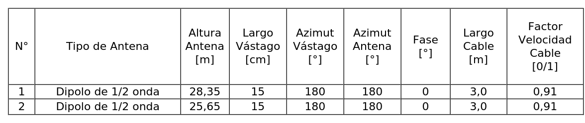 - Arreglo de antenas de acuerdo a la siguiente tabla: