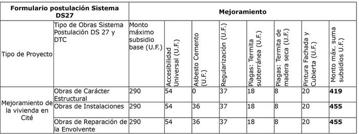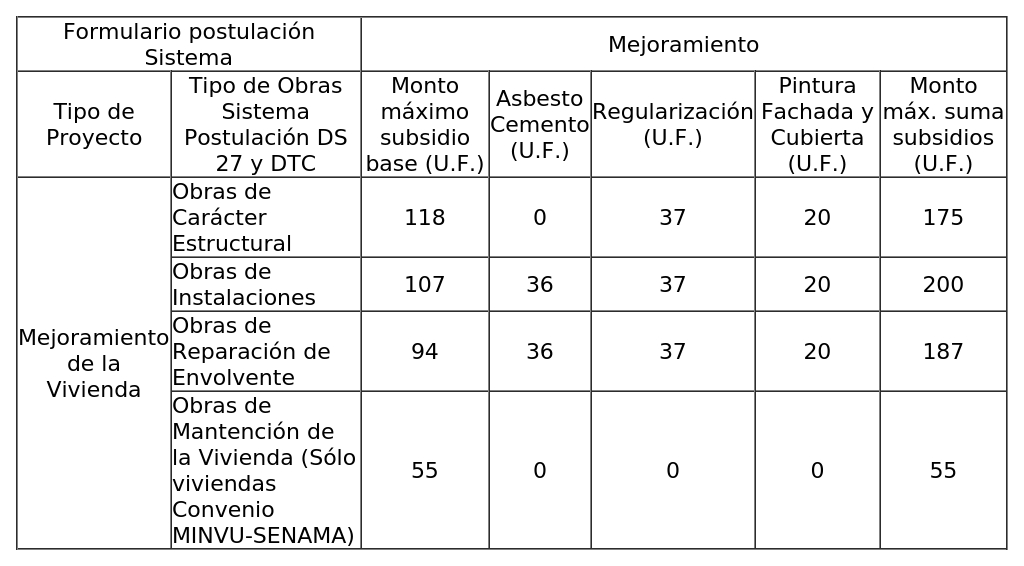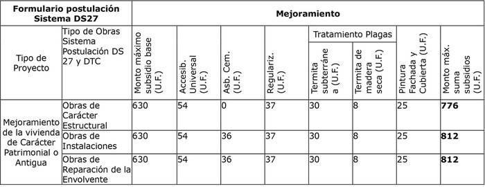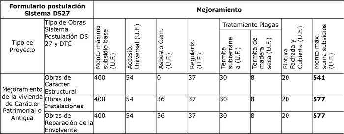"7.1.1. Las viviendas que postulen proyectos de Mejoramiento de la Vivienda deberán presentar como mayor factor de obras en su DTC las siguientes: Obras de carácter estructural, obras de instalaciones u obras de reparación de la envolvente. En consecuencia, los DTC que se presenten en esta línea de atención, cuya obra predominante dé como resultado mantención de la vivienda y/o ampliación, serán eliminados del proceso de postulación, exceptuando aquellos DTC asociados a viviendas pertenecientes al Convenio Minvu –Senama , así como a viviendas que postulen a proyectos de mejoramiento para discapacidad, en los cuales el mayor factor de obra podrá ser mantención de la vivienda.